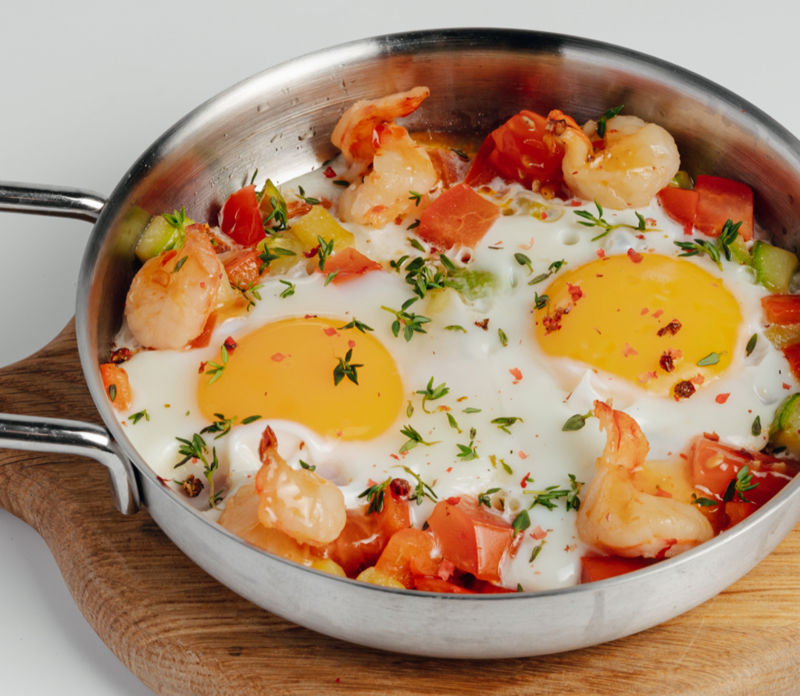 Яичница с креветками на сковородке